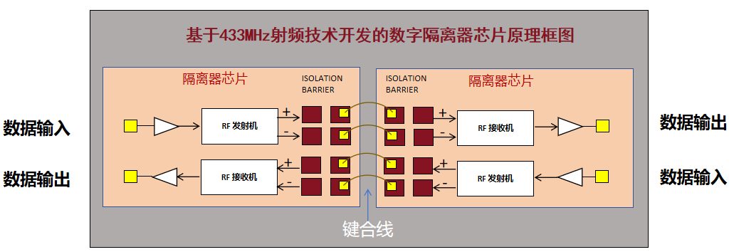 具体而言,在哈哈体育微自主研发的容耦隔离器中,射频发射端会将要传输的数据信号通过OOK调制为高频脉冲信号,而后在电容电场的耦合作用下,高频脉冲信号耦合至射频接收端,并通过OOK解调为初始的数据信号,从而在电气隔离环境中完成数据信号的有效传输。容耦隔离器的功耗基本不随着传输数据速率的变化而改变。