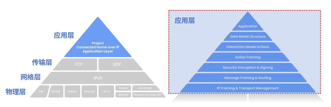 在网络层,Matter协议基于IP架构,可无缝兼容Wi-Fi、Thread和BLE等底层无线通信协议,令其不再是非此即彼的竞争关系,其中:Wi-Fi负责高带宽设备的数据传输,Thread负责构建低功耗的Mesh网络,BLE用于便捷快速的设备配网工作。此外,Matter还可使用Matter Brige桥接Zigbee、Z-Wave等非IP无线通信协议。