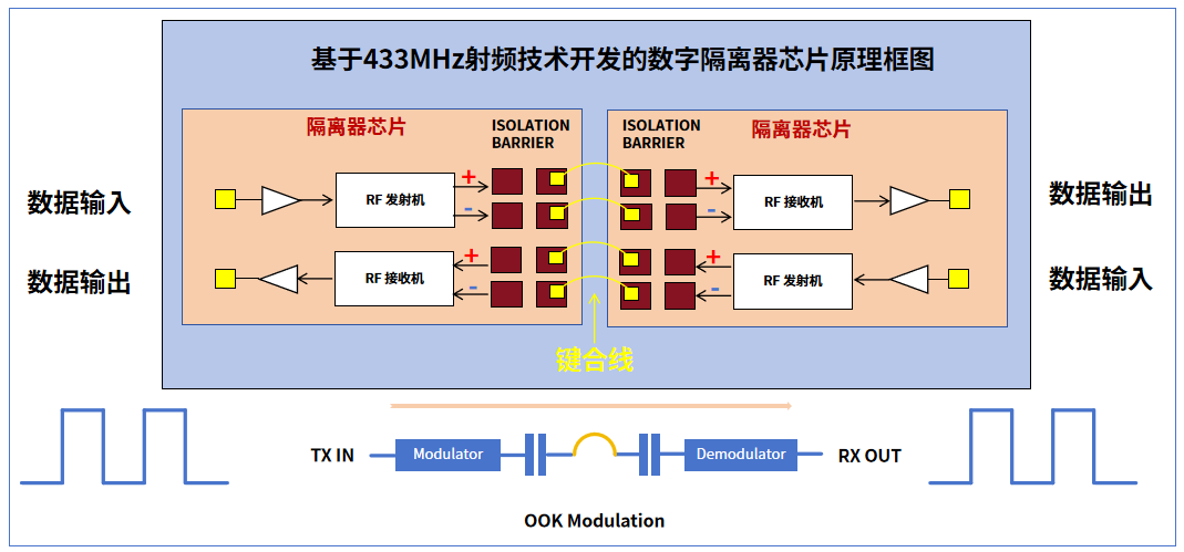 为迅速解决这一行业痛点,保障客户产品在使用基于OOK的电容耦合数字隔离器时能在其他通信频段中(如315MHz、433MHz、 868MHz、915MHz、2.4GHz等)维持良好的通信质量。针对前文所述干扰机制,哈哈体育微研发了一种从射频链路源头抑制谐波的数字隔离器,即定频隔离器。