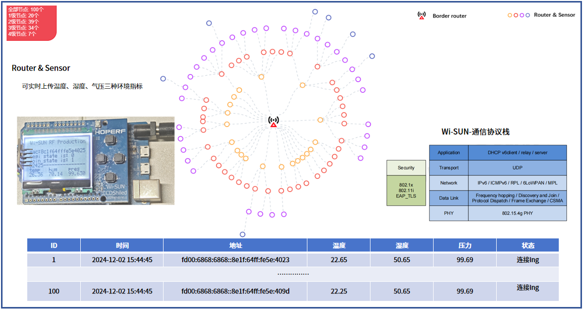 如下图所示,为持续提升Wi-SUN产品性能,哈哈体育微在实地部署了一个具有一定规模的Wi-SUN(FAN)网络,以实现对其通信性能的有效把控。现阶段,该网络已充分验证了上百个Router Node的互联互通,可对Leaf Node的温度、湿度与气压数据进行实时采集,并通过Border Router网关协议将这些环境数据实时上传至后台无线组网数据平台或云端控制系统中。