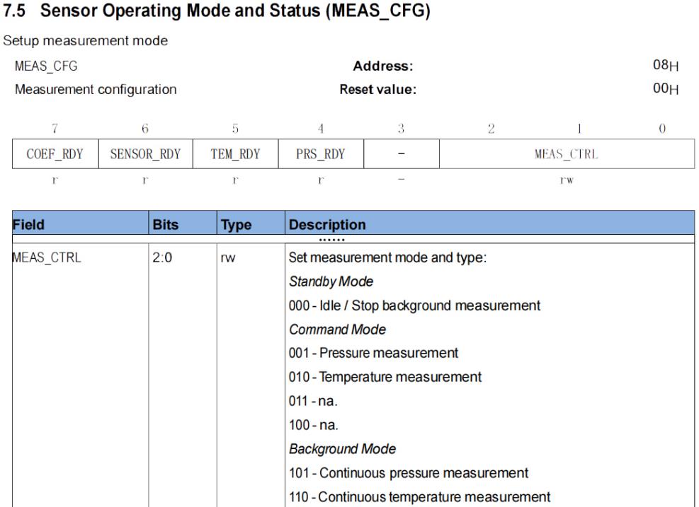 HPS27W支持待机、命令、后台三种运行模式与不同的测量速率、精度,可通过向传感器内部的Sensor Operating Mode and Status (MEAS_CFG)寄存器写入参数值,配置传感器的运行模式与测量速率、精度,以灵活适应多种不同的场景需求。