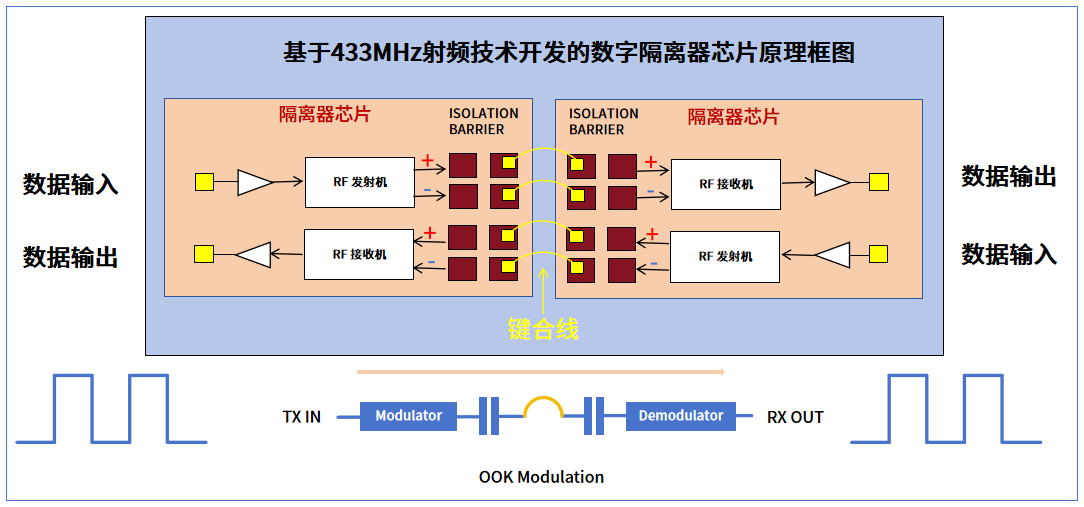 其中,在数字隔离器领域,哈哈体育微产品主要基于433MHz射频技术开发,并采用了经典的OOK调制方案,其本质是一种具备微型无线射频收发系统的芯片。