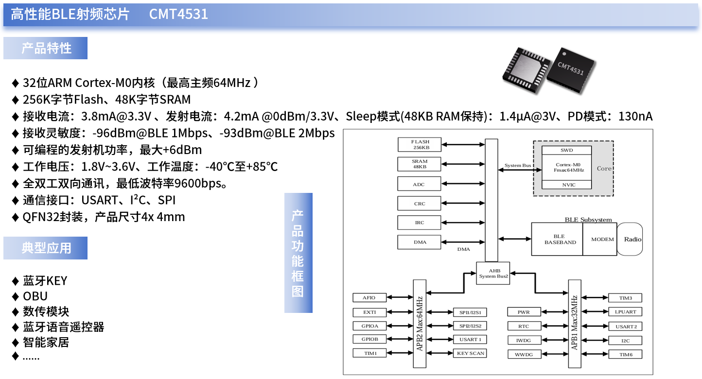 例如,哈哈体育微自主研发的CMT4531就是一款高性能的BLE射频芯片。