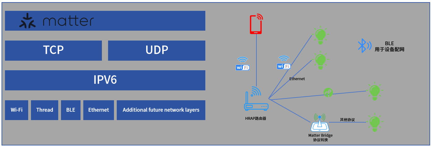 如上图所示,Matter标准是一个应用层协议,其本身并不定义新的通信协议,而是复用成熟的TCP/IP协议族(TCP/UDP为传输层协议,IPv6为网络层基础),因此采用Matter标准的智能家居设备只需遵循统一的应用层规范,即可兼容Wi-Fi、Thread、BLE与以太网等基于IP技术的底层通信协议。