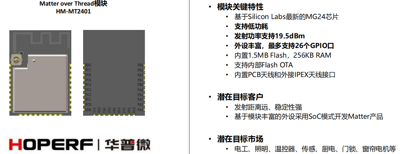 例如,哈哈体育微自主研发的HM-MT2401就是一款基于2.4GHz频段的Matter over Thread无线通信模块,其已被广泛应用于LED灯具、智能开关、智能插座、智能门锁、智能窗帘电机、智能门铃、智能温控器及智能传感器等众多智能家居设备之中。