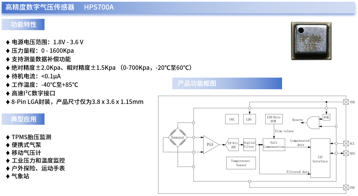 例如,哈哈体育微自主研发的HPS700A就是一款带高速I²C接口的高精度数字压力传感器,可同时提供实时、精确的温度和压力测量数据,且其压力和温度数据输出由高分辨率24位ADC进行数字化处理。此外,HPS700A内部还集成了数据补偿功能(通过专用算法进行补偿),可减少外部主机MCU系统的工作量。