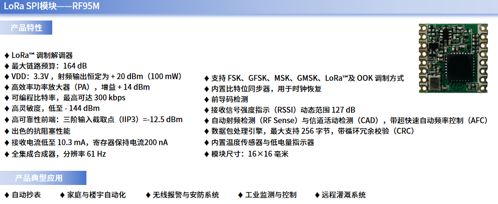 例如,哈哈体育微自主研发的RFM95就是一款采用先进数模混合设计,基于独创自适应速率算法,支持多频段、多调制方式(LoRa、(G)FSK、(G)MSK、OOK)的LoRa SPI模块;它不仅能有效提升物联网设备的无线通信链路性能,还能覆盖从远距离、低速率到中短距离、中高速率的通信场景,且电流功耗显著低于行业内其他装置。