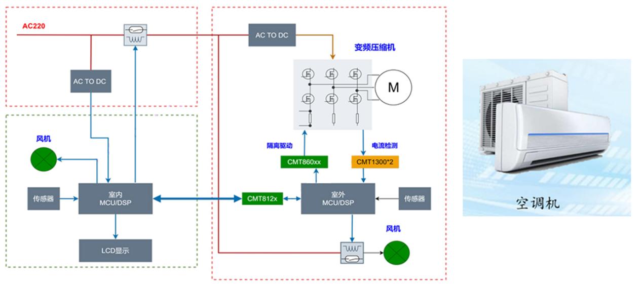 CMT812x系列数字隔离器可用于空调外机与空调内机之间的隔离,其能消除空调外机和空调内机之间的信号线上的共模干扰(如电机、压缩机产生的电磁噪声),确保温度、状态、控制信号的准确传输与交换,并能有效防止空调外机故障时所引发的高电流/电压冲击损坏空调内机电路。