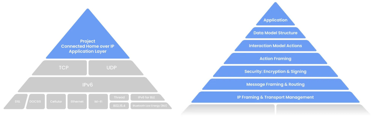 从技术层面讲,Matter 是基于 IPv6的连接 协议,兼容 Wi-Fi、Thread和以太网等多种底层网络技术,可让不同品牌、不同协议以及不同生态平台下的智能家居设备使用“同一种语言”进行无缝的交互。