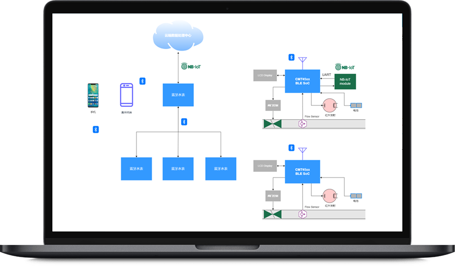 ⽔表端采⽤蓝牙芯片作为主控制器,通过串⼝、I2C、SPI、GPIO等与NB-IoT模块、传感器,阀⻔控制器等连接。